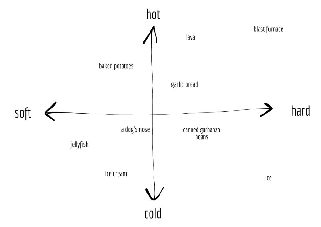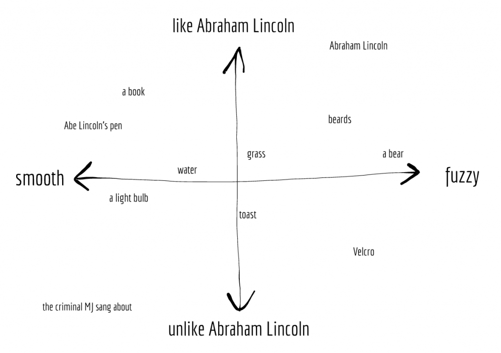 One easy way to begin mapping out a space is by building “quadrants” composed of two axes, where each axis is a quality or descriptor. If something is far along one axis, it means the thing is very like that quality that the axis represents.