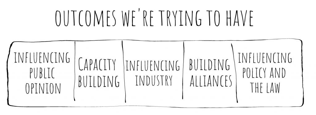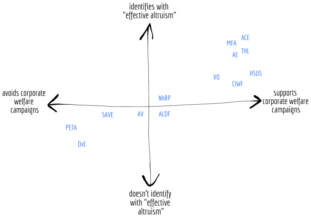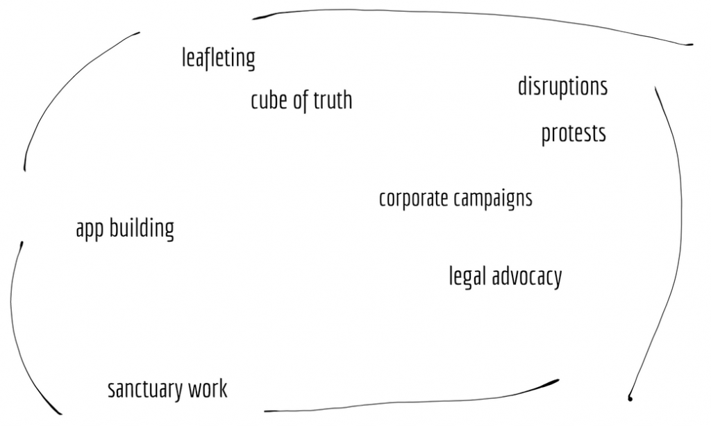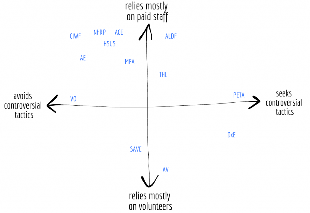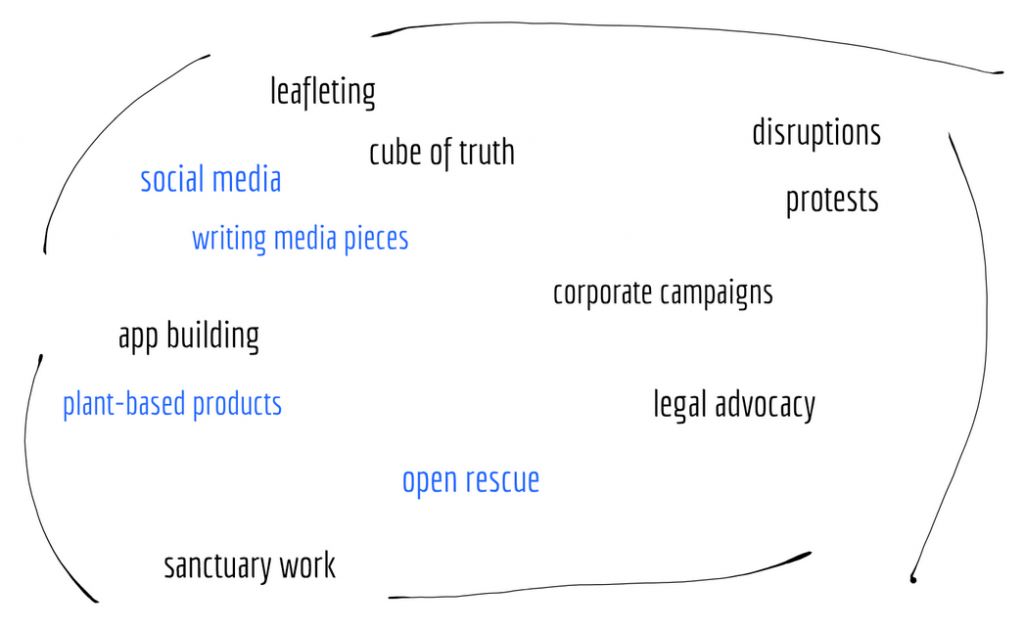 One space we could look at is the space of tactics an organization might use: from leafleting, to protests and disruptions, to corporate campaigns, to individual animal care, to app building, to legal advocacy.