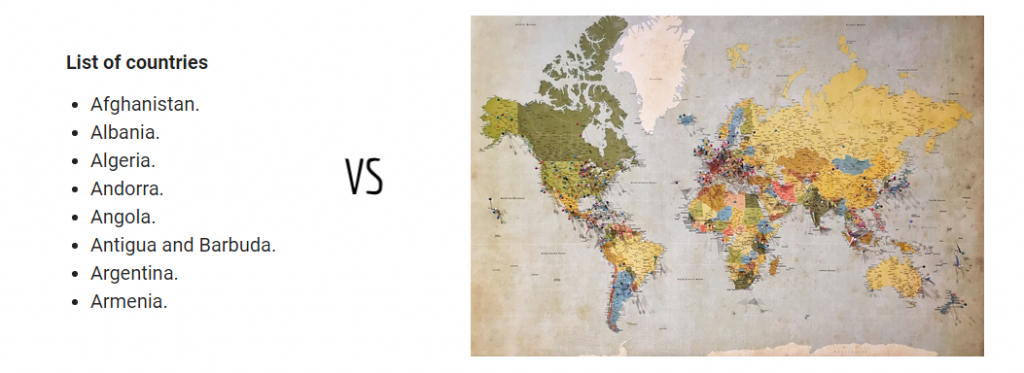 As a more concrete example, let’s go back to our example of a map of the world. On a map, one possible MECE division would be to draw lines between countries (and also lines dividing countries from bodies of water). Any point on the map will only be a part of one country or body of water, and the whole globe will be sectioned off into countries and water. It’s both mutually exclusive (things can’t be in more than one group) and collectively exhaustive (the whole map has been categorized).