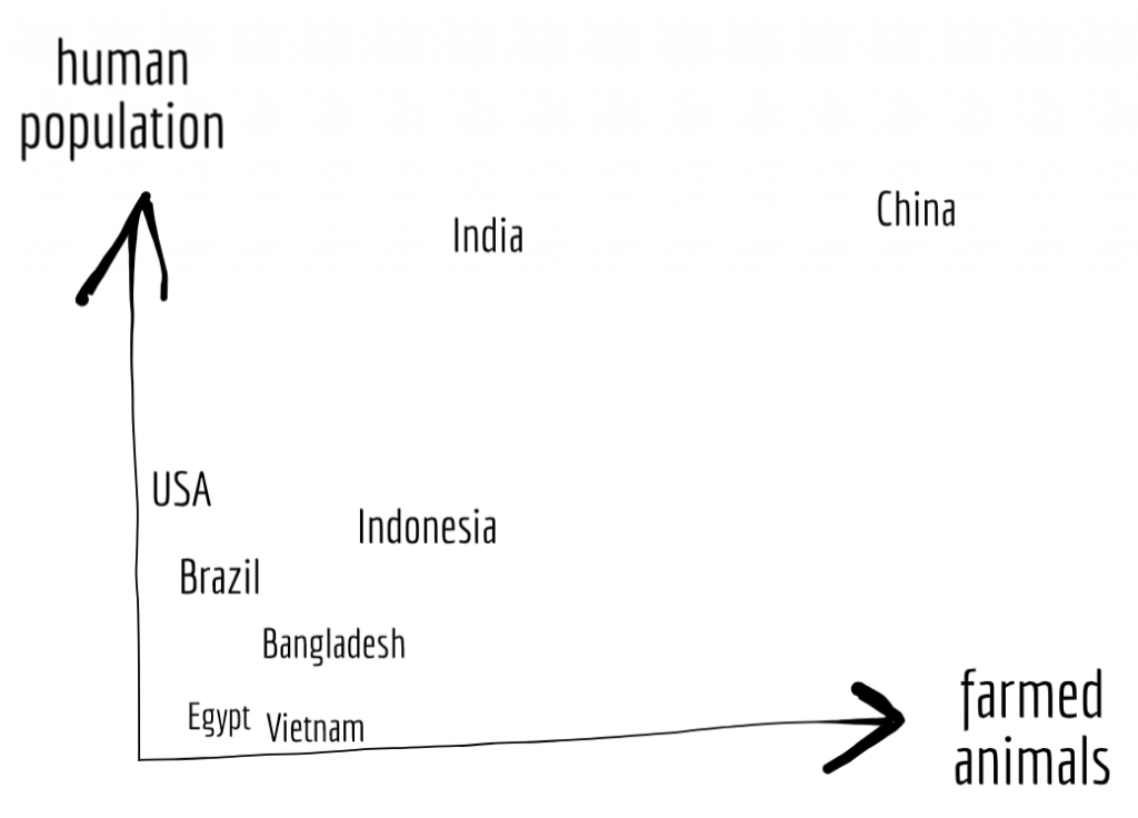 Even with a very rough graph (not very precise, no tick marks on our axes, no labels, etc.), one of the most important results jumps out at us: China has way more farmed animals than other countries. This is one of the powers of visualization—you can easily see the important points and filter out the noise.