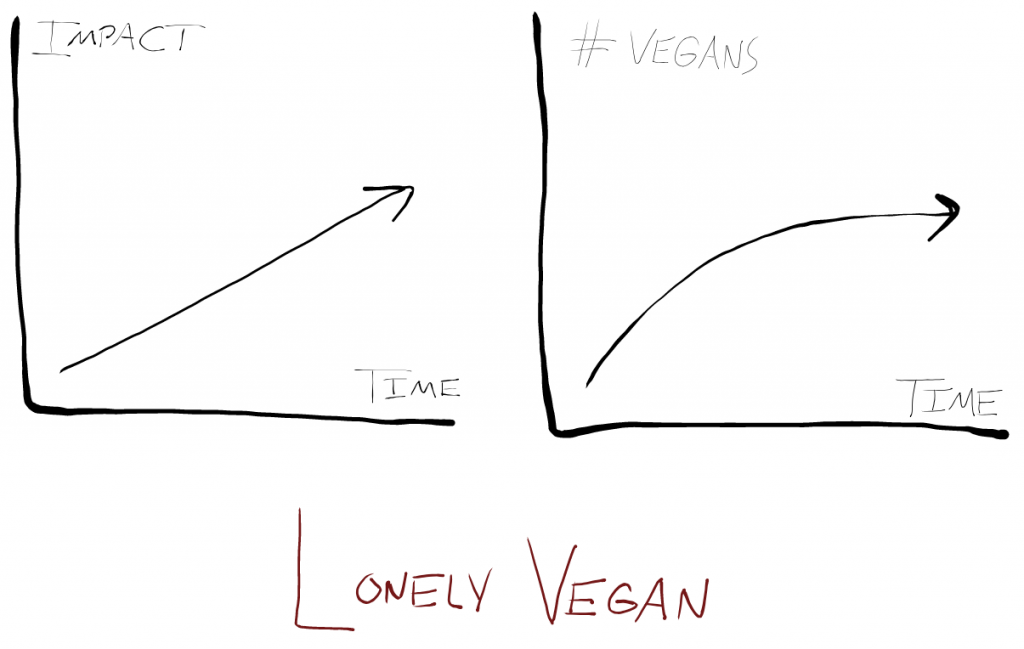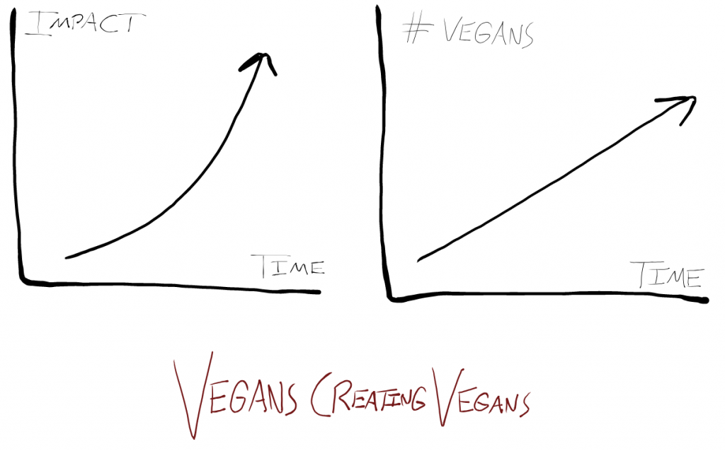 Or, we can create vegans who create other vegans. This is compounding impact. It’s like investing money in developing a wooden fence that creates other wooden fences, or a wooden fence that starts a wooden fence company for you and makes you thousands of dollars in profits.