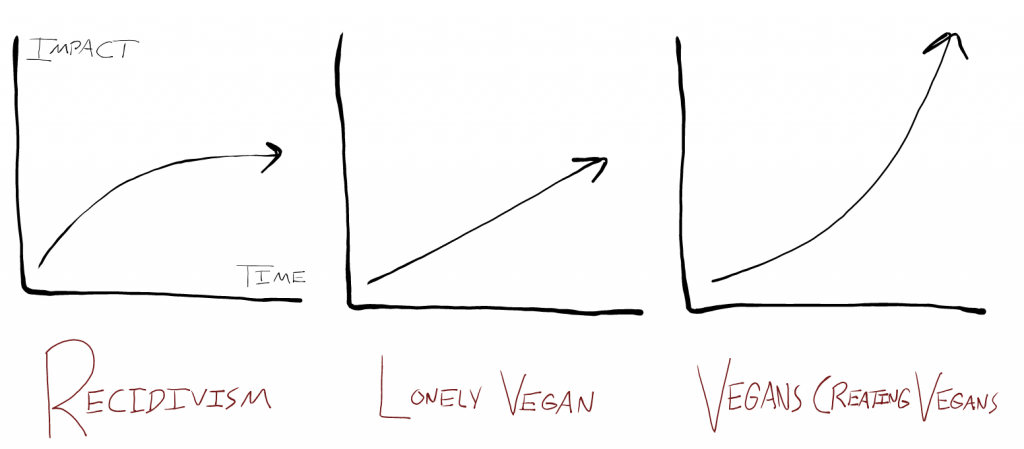 But, because of recidivism, maybe all 10 of those people go back to eating animals the very next year. After a decade of work, we’ve gotten 100 people to go vegan for a short length of time, but then everything goes back to the way it was before.